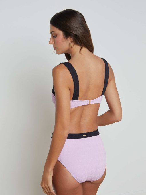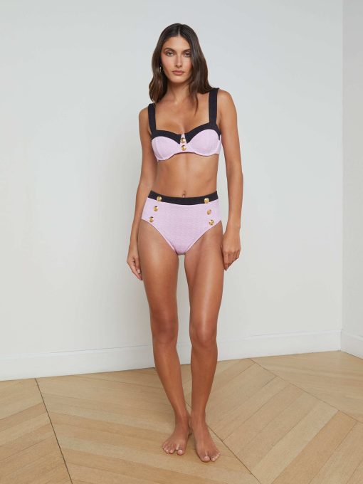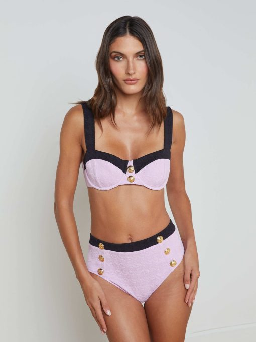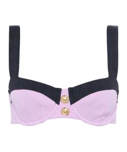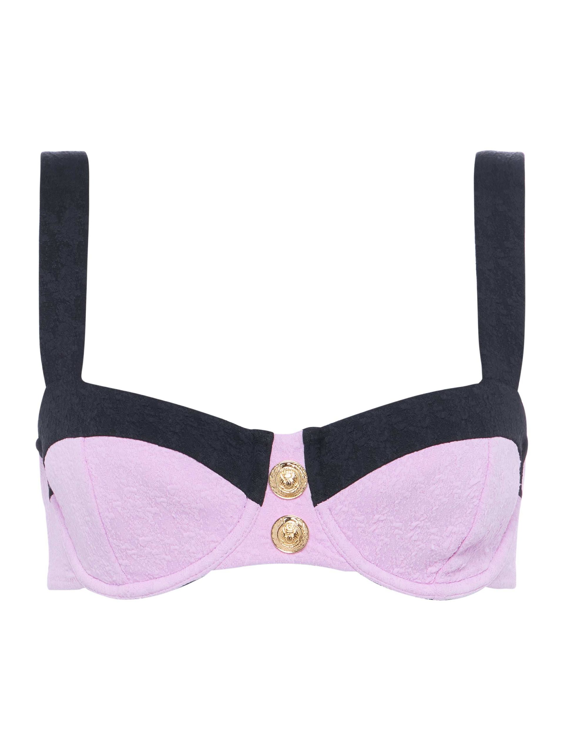 A sweet balconette bikini top, made sweeter with black contrast trim and decorative gold buttons.
