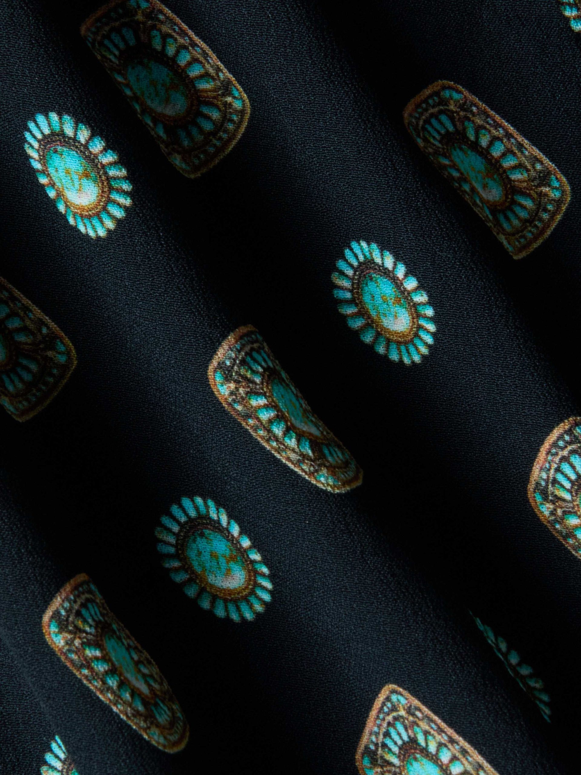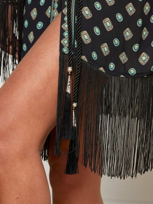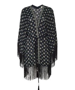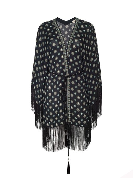 Add a touch of drama with this breezy cover-up kimono, featuring a geometric medallion print, contrast trim, and flowy fringe trim.