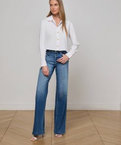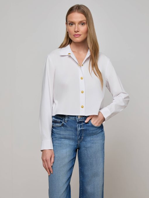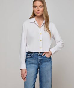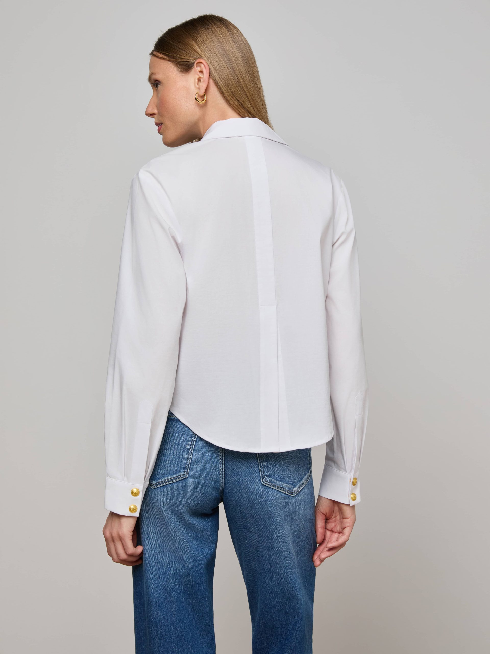 A classic tailored shirt with a cool, borrowed-from-the-boys fit and miniature embossed dome buttons for a touch of glamour. Now in white and gold.