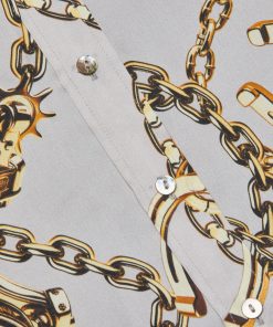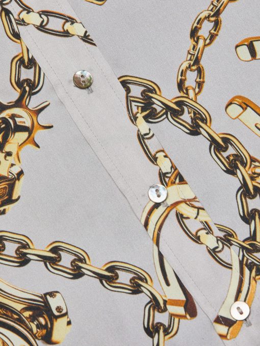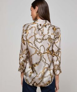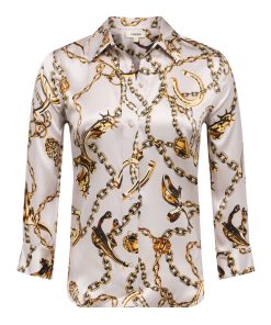 Meet the iconic silk button-down that belongs in every wardrobe. Our signature three-quarter sleeve shirt is back in a gold chain and horn print.
