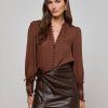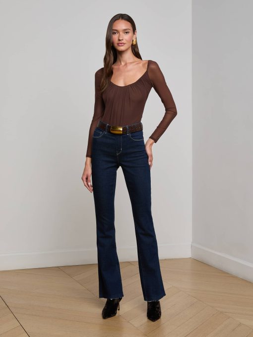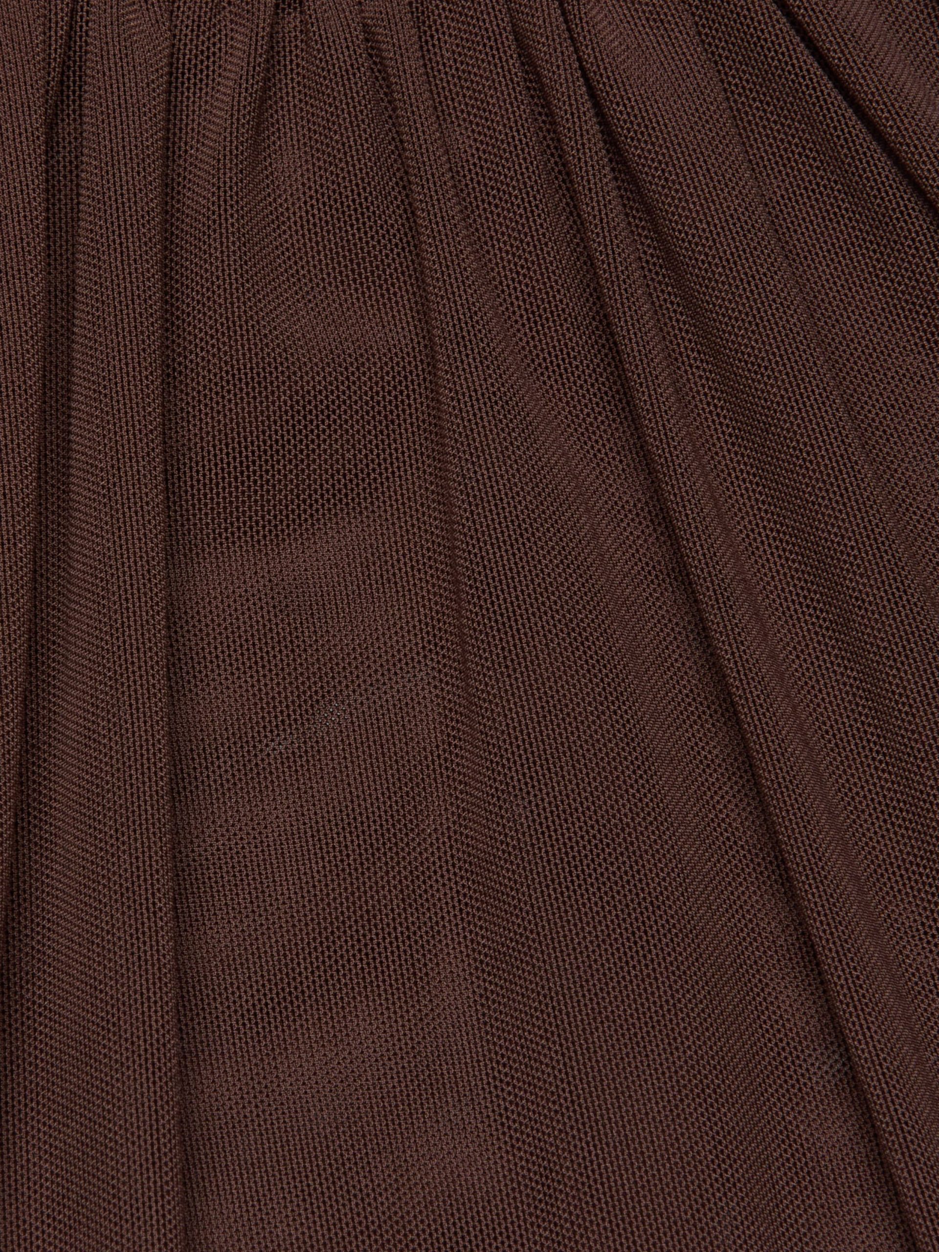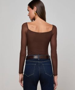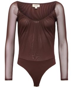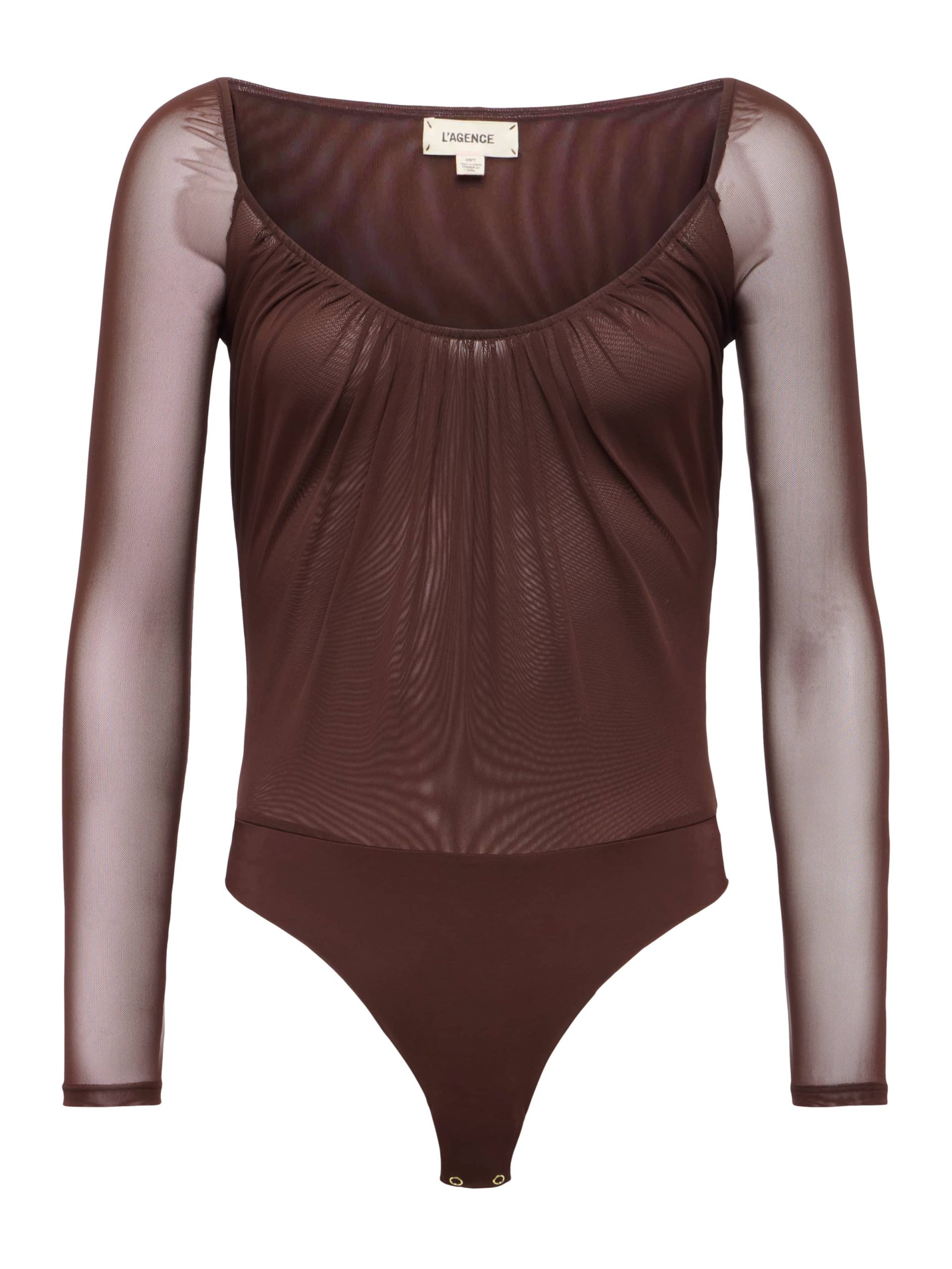 The Gwendolyn bodysuit is crafted from lightweight stretch mesh, featuring sheer long sleeves and delicate front gathering for an ultra flattering fit. In a rich brown tone, it offers understated versatility as a base layer or on its own.