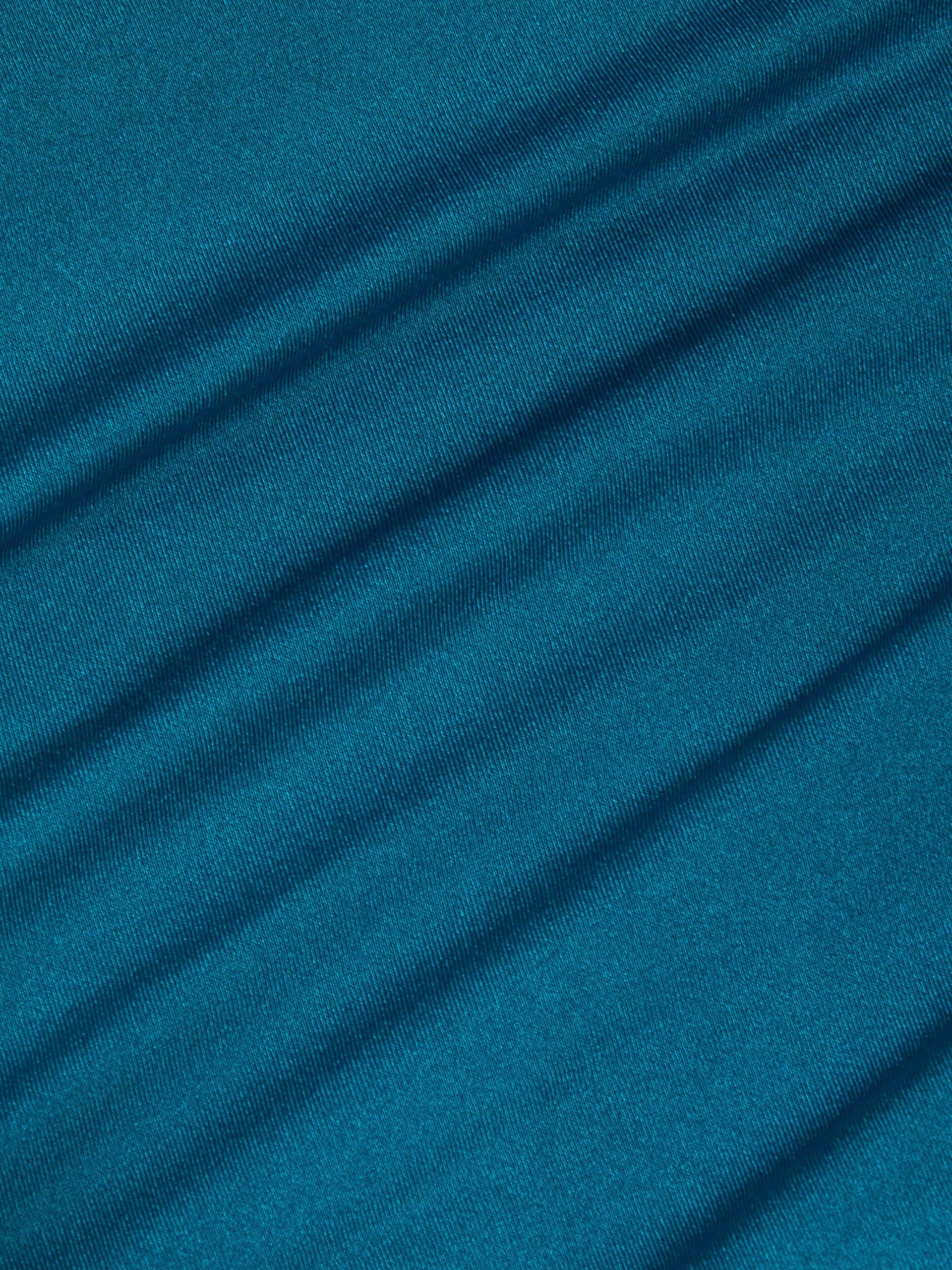 Make a splash in the Hadley, a striking teal one-piece, featuring a plunging neckline, twist-front detail, and an open back with draped, knotted straps.