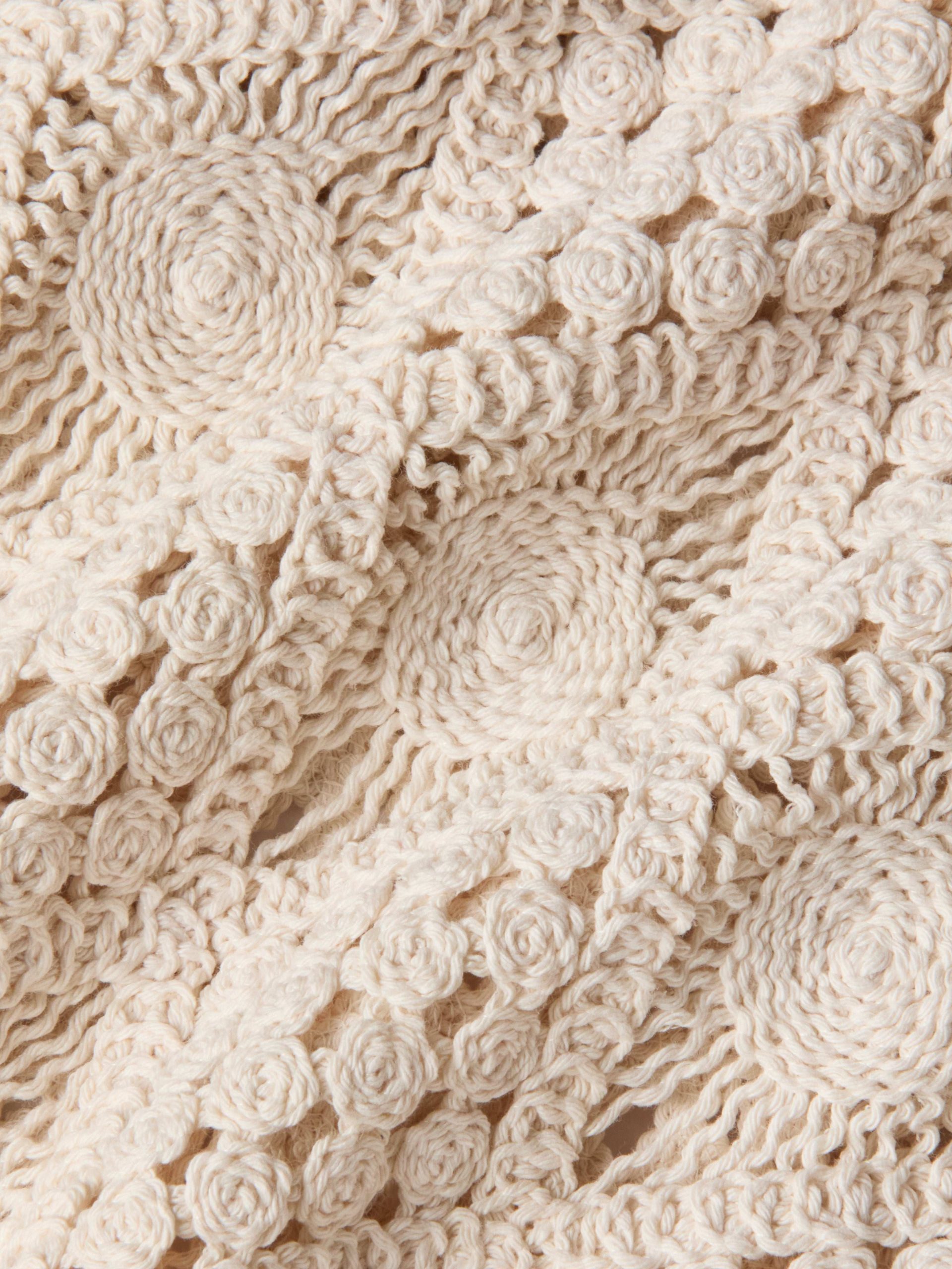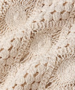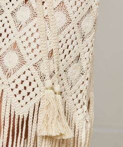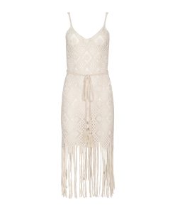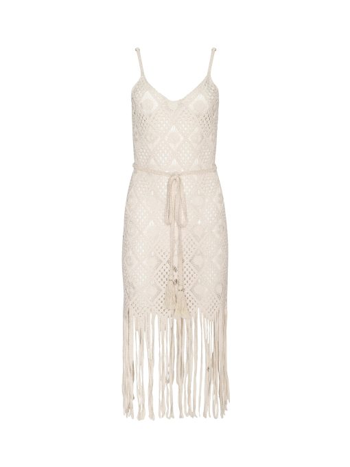 Boho meets beachy in this diamond-pattern crochet dress, featuring a flattering tie waist, spaghetti straps, and a fringe hem that moves with every step.