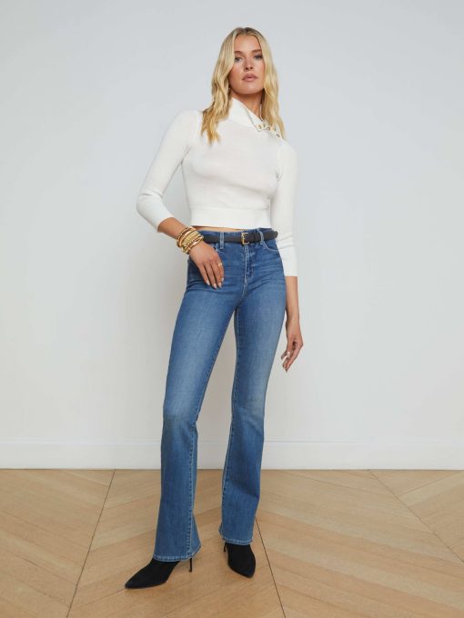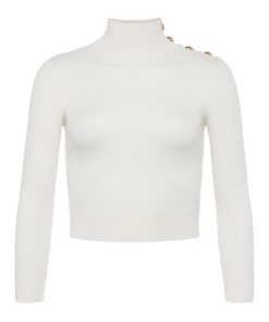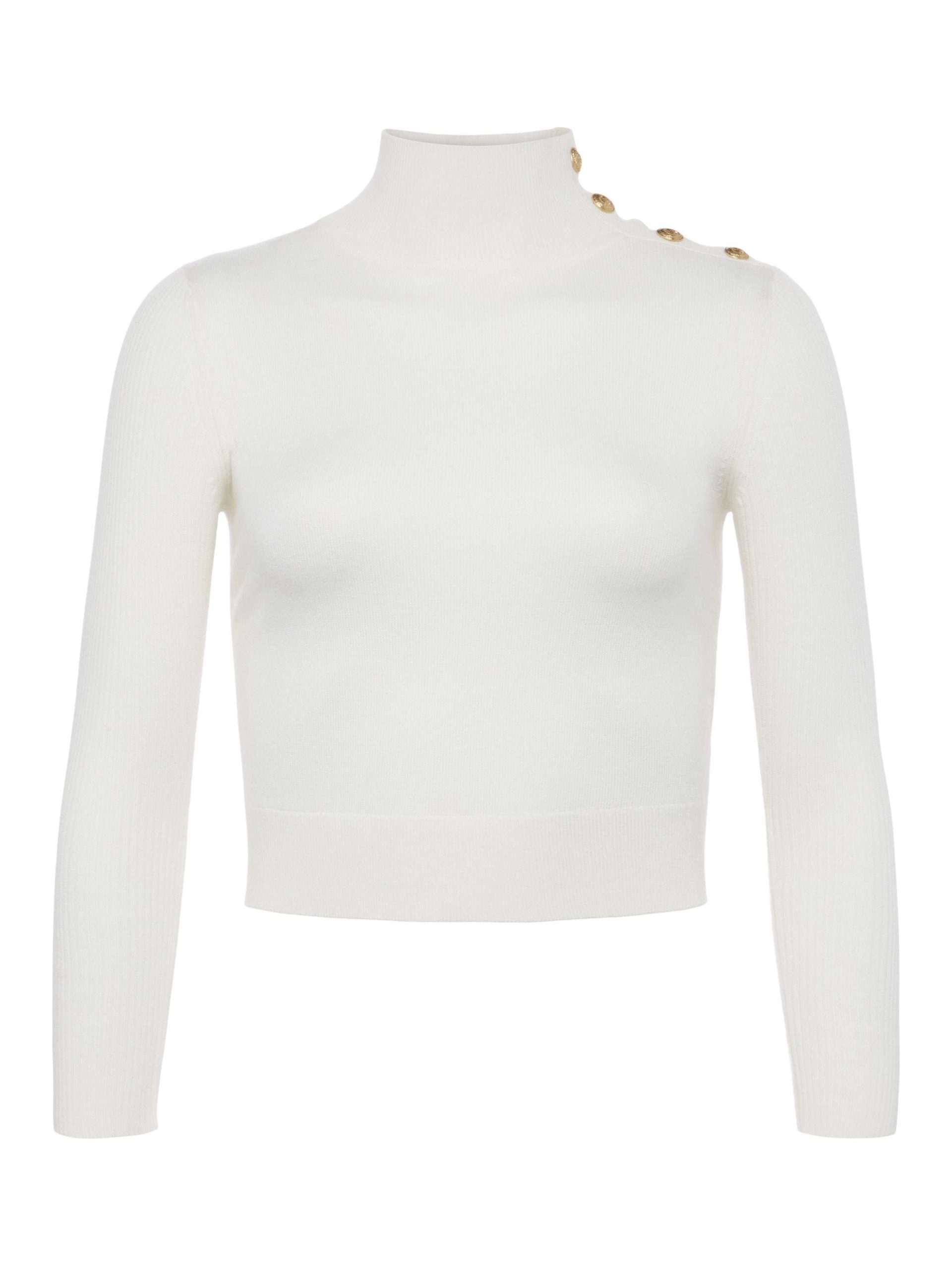Functional snap buttons allow for the Kamdyn mock neck to be worn upright or folded over. Now back in a versatile ivory.