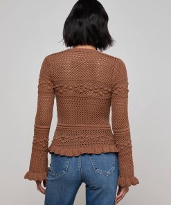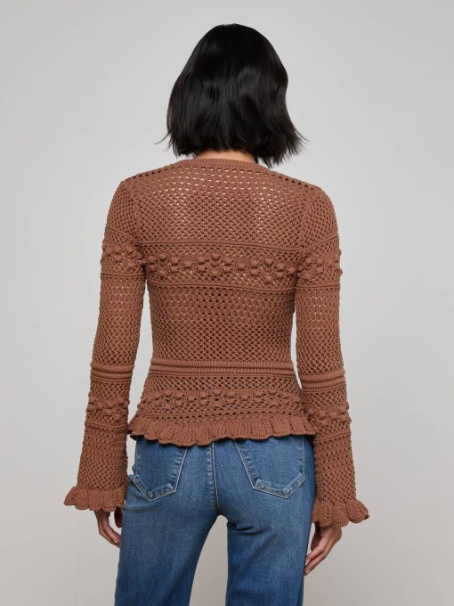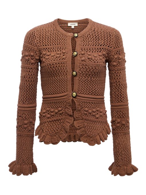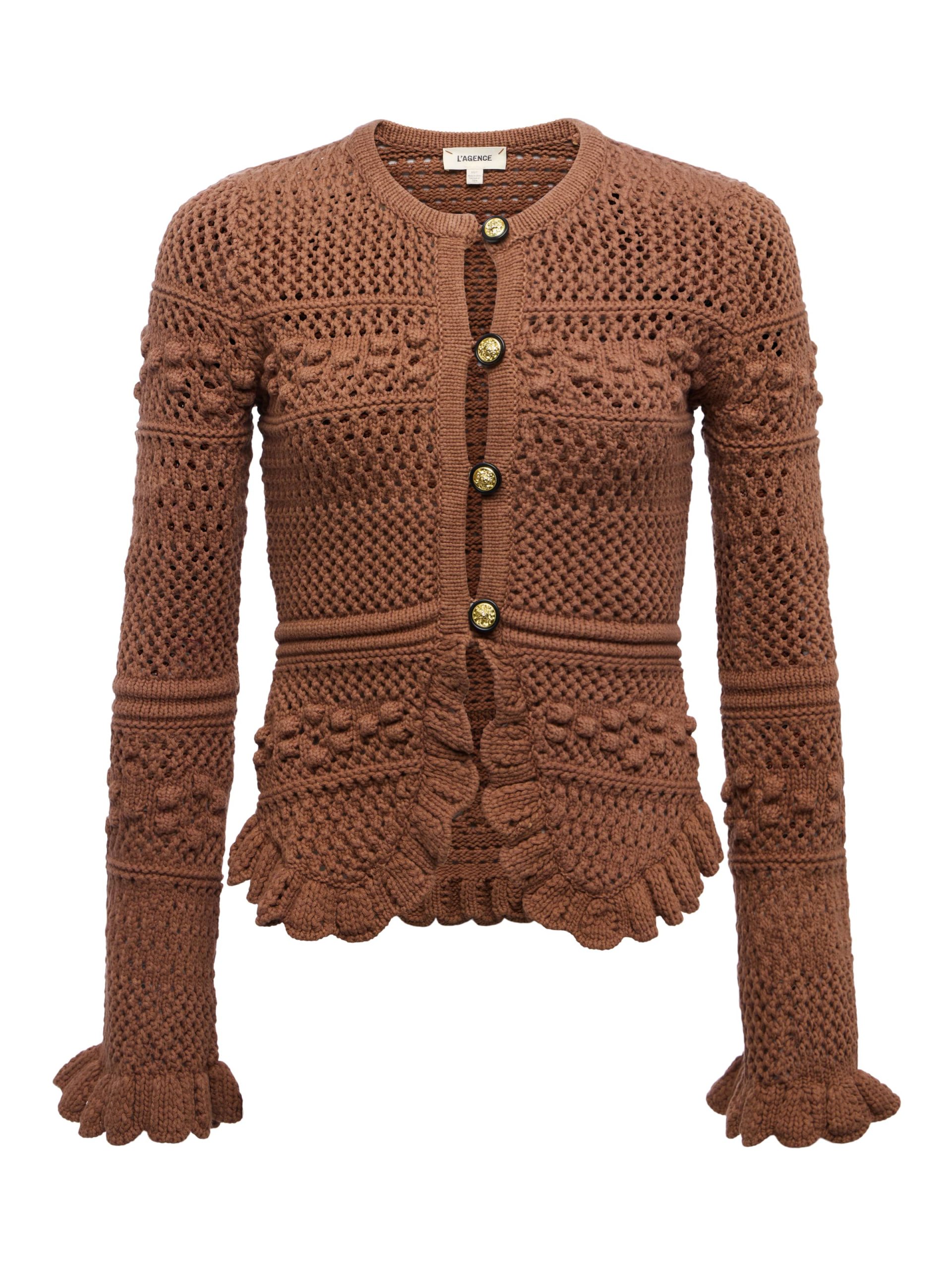 A ruffled cardigan with rich texture and charm, crafted from an open-stitch knit with statement buttons, and playful scalloped hems. Romantic, cozy, and perfect for layering with anything and everything.