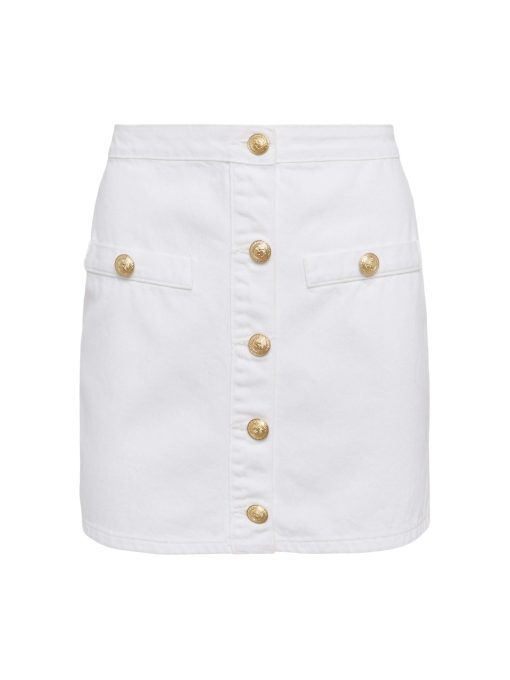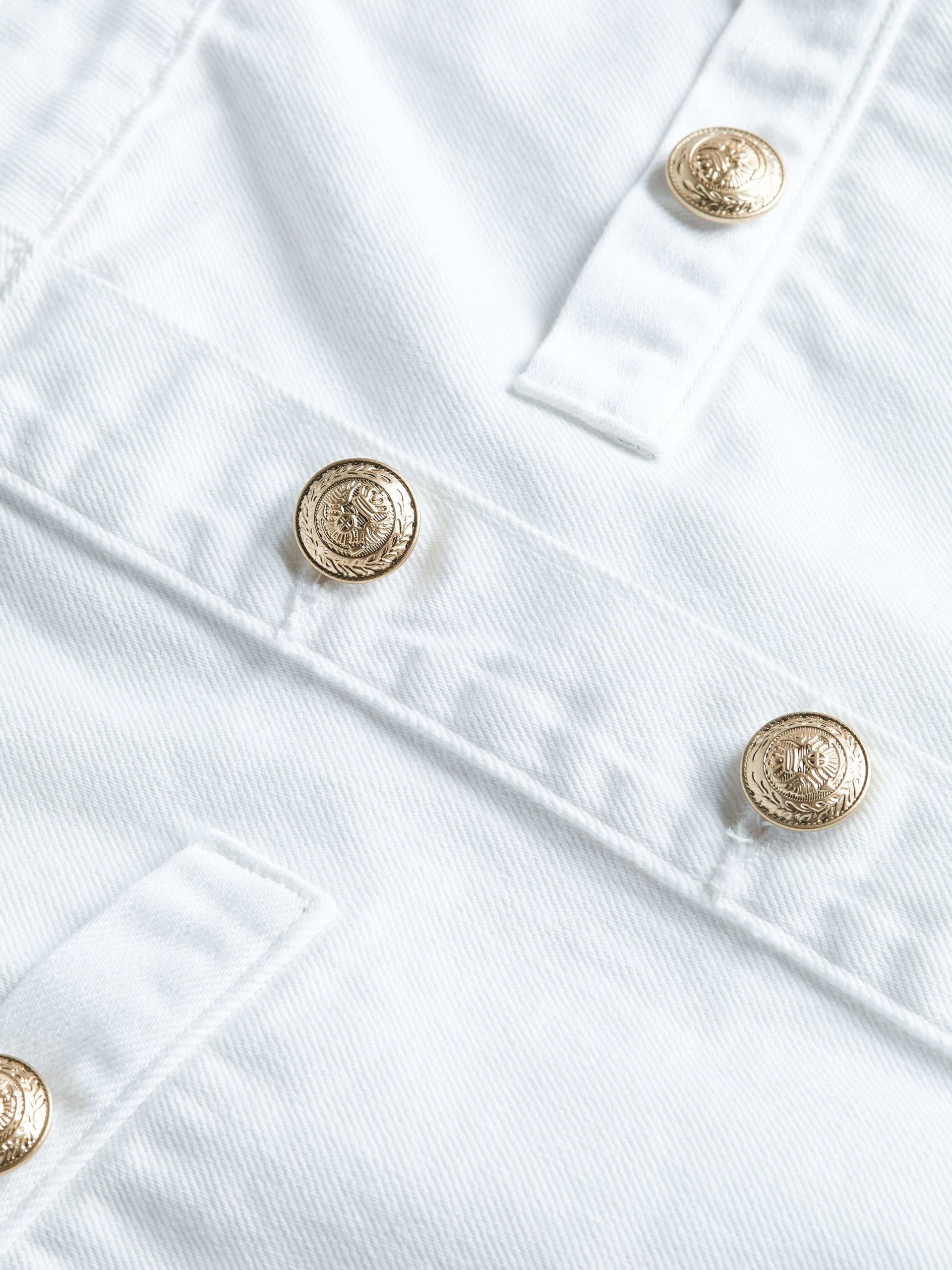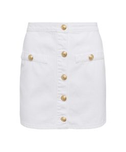 Just in: a versatile four-season miniskirt in timeless white. The all-cotton denim Kris hugs the natural waist before falling straight to high thigh. Featuring a button-front with welt accents that lend a smart sophistication, and our signature embossed dome buttons. For warm days wear with a tee and sandals or sneakers. Slip on tall boots and a turtleneck when the weather turns cool and crisp. Style No. 3429KDW-BLAN
