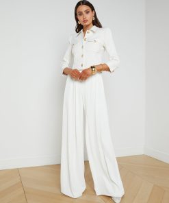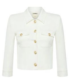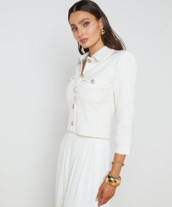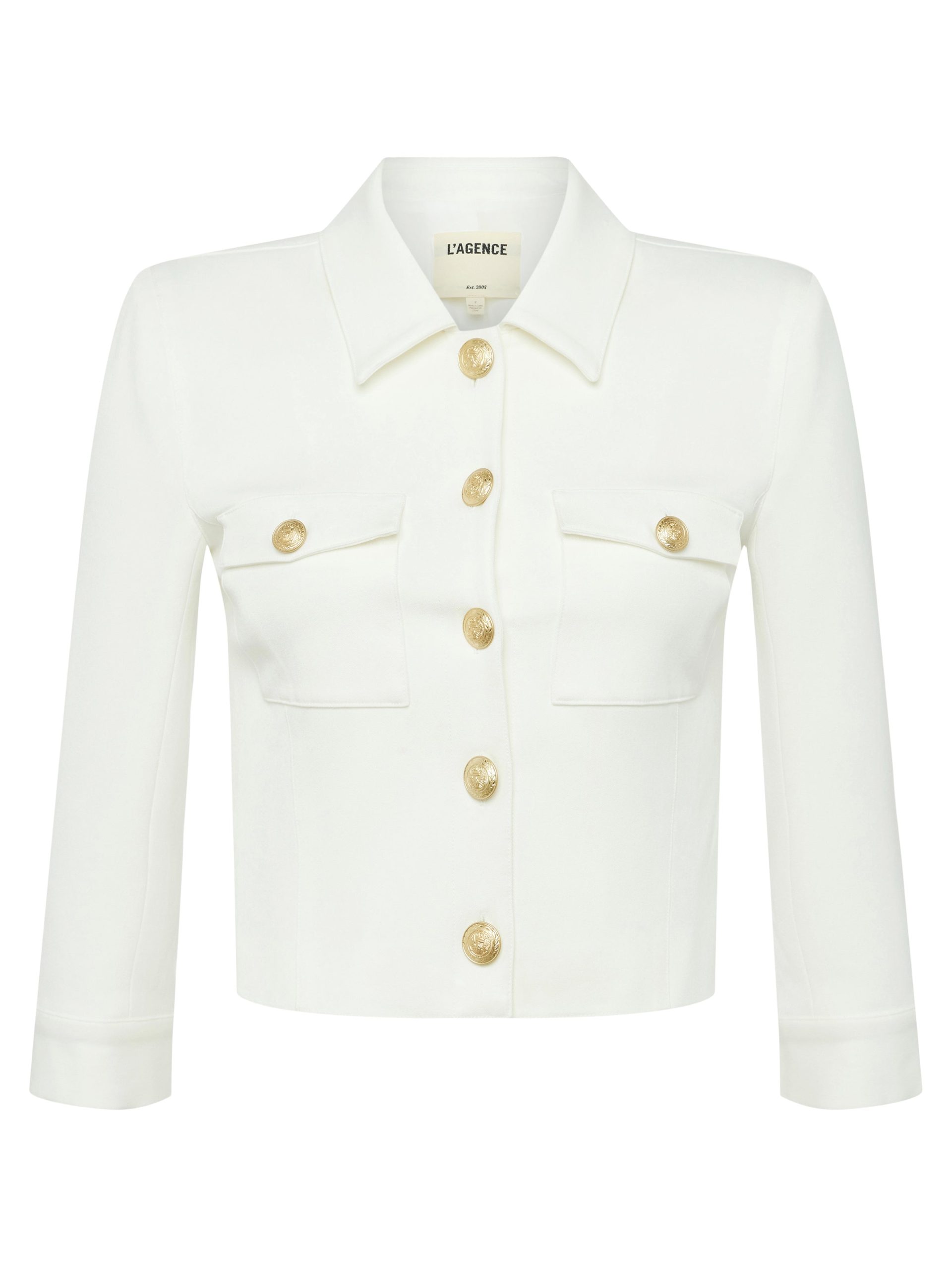 The Kumi is our modern update to the classic three-quarter sleeve jacket. A strong shoulder and tapered silhouette create flattering definition. This versatile white style is crafted from a supple stretch-suiting fabrication and finished with flap pockets and our signature gold embossed dome buttons. Pair with high-waisted denim for a perfectly proportioned look.