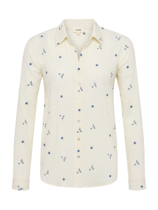 The Laurent is our relaxed fit long sleeve button-down, now in a textured off-white cotton with beautiful blue floral embroidery.