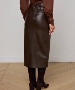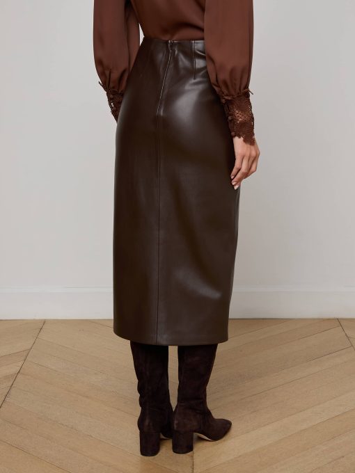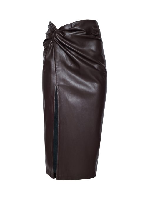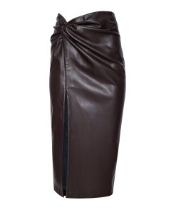 The Lilou skirt in vegan leather brings a sultry edge to sleek tailoring with a high front slit while the subtle front knot detail creates shape and dimension. Refined yet daring, it’s a versatile piece that pairs just as effortlessly with a soft blouse as it does with a sharp blazer. Now in coffee brown.