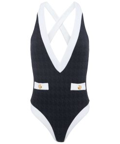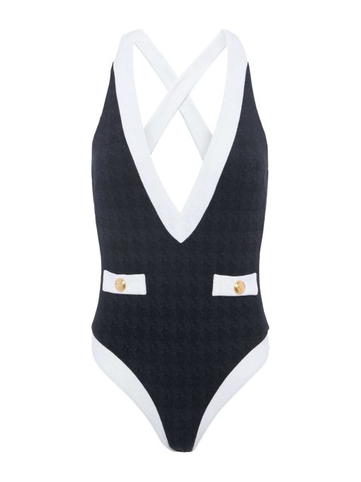 Contrast trim brings old-school glamour to our modern plunge one-piece swimsuit.