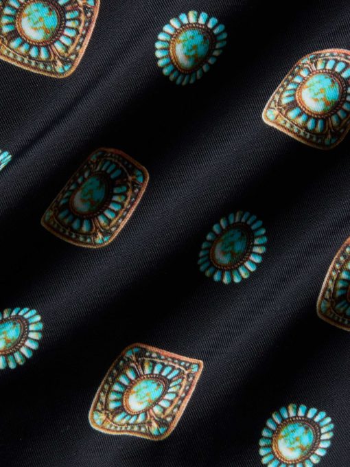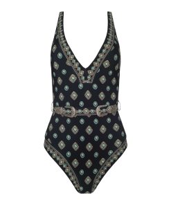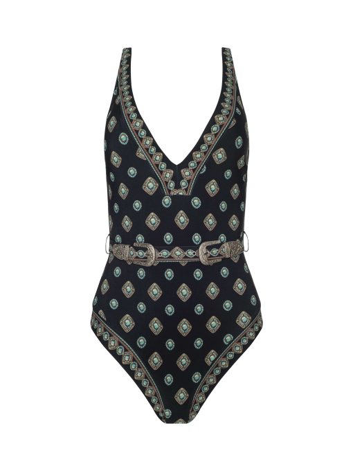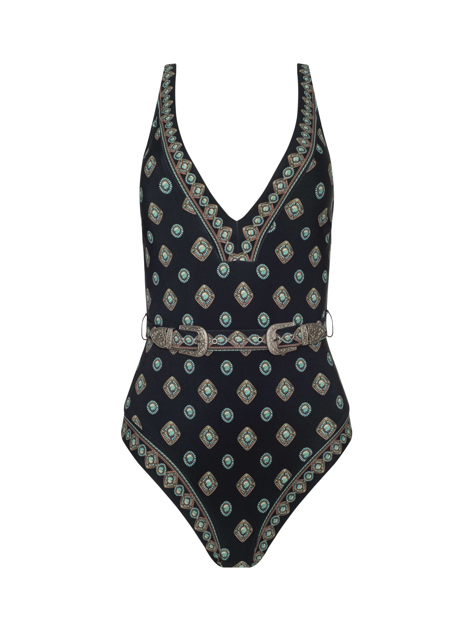 A deep, plunge neckline and embellished waist belt add ultra flattering definition to the Lisa one-piece swimsuit. Now in a geometric medallion print.