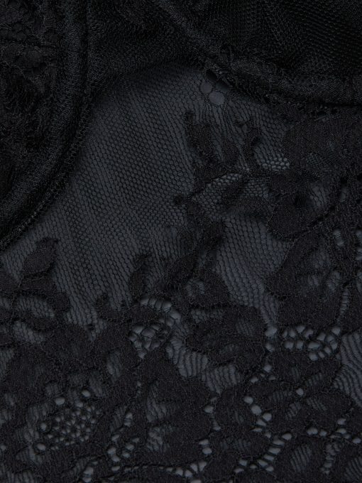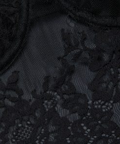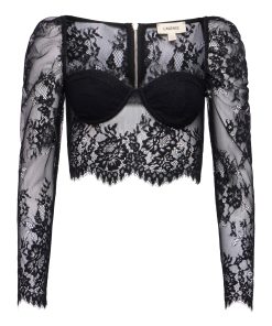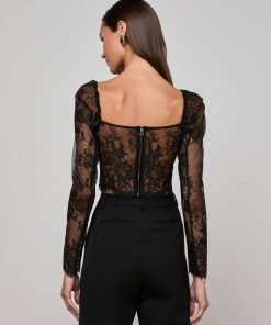 Delicate yet daring, this romantic bustier top is crafted from sheer black floral lace with a sculpted bodice and scalloped edges. The structured cups offer shape and support, while subtle puff sleeves and an exposed back zip add a touch of drama. Pair the Lori with black trousers for an unforgettable evening look.