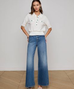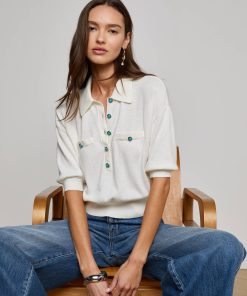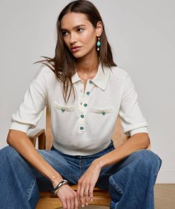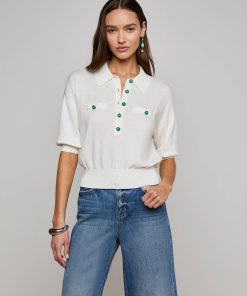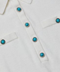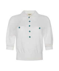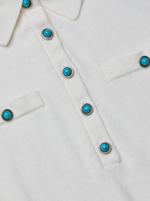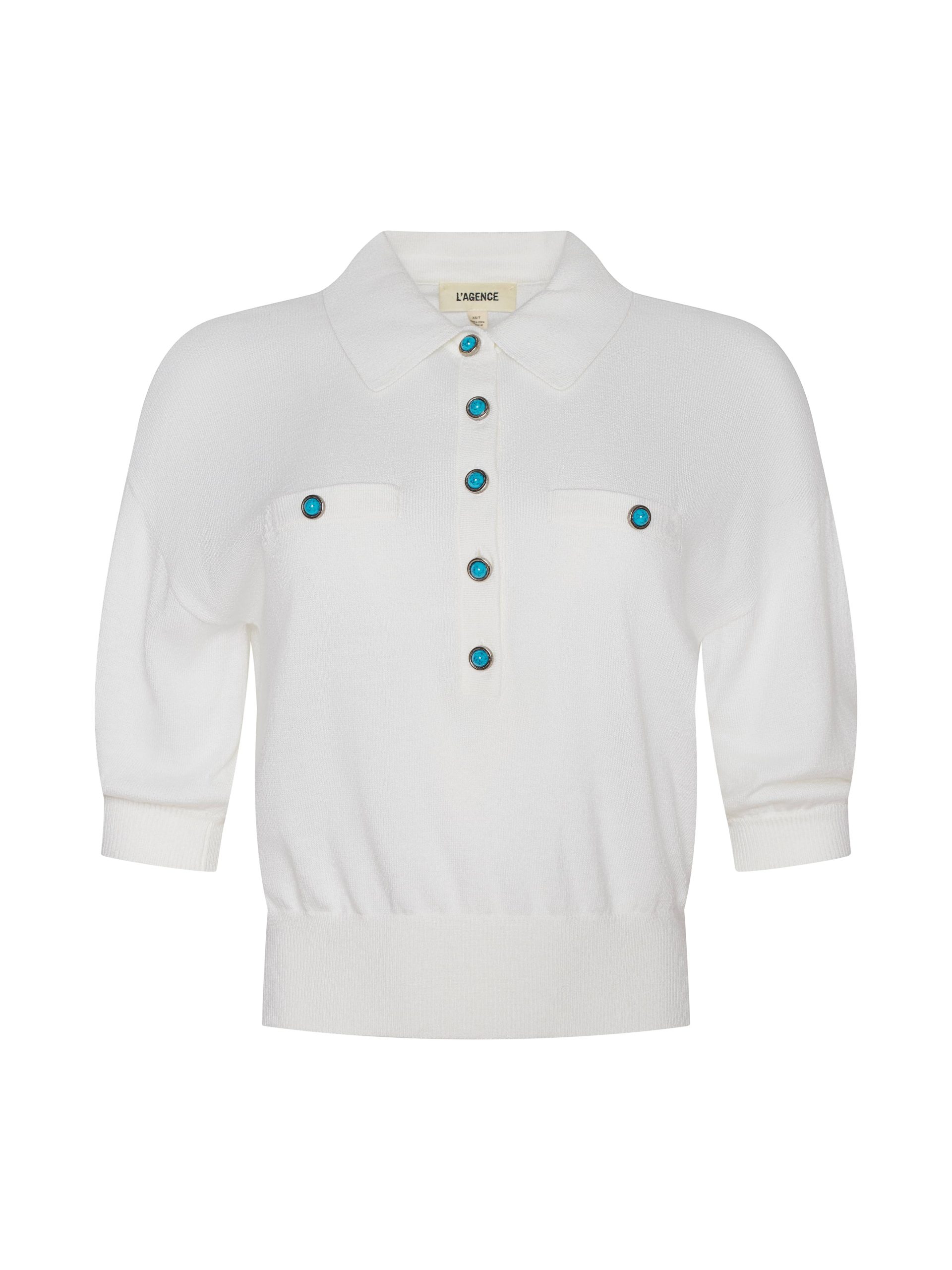 The perfect little sweater, ultra soft and super chic. The Masaki is the definition of polished prep, constructed with a relaxed silhouette that finishes in a wide, defined waistband that creates a cropped fit. Now in white with turquoise buttons.
