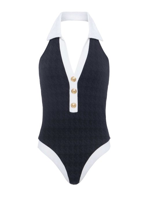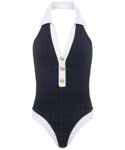 French sophistication in a swimsuit. A chic white collar and contrast trim add an element of prep to this classic one piece.