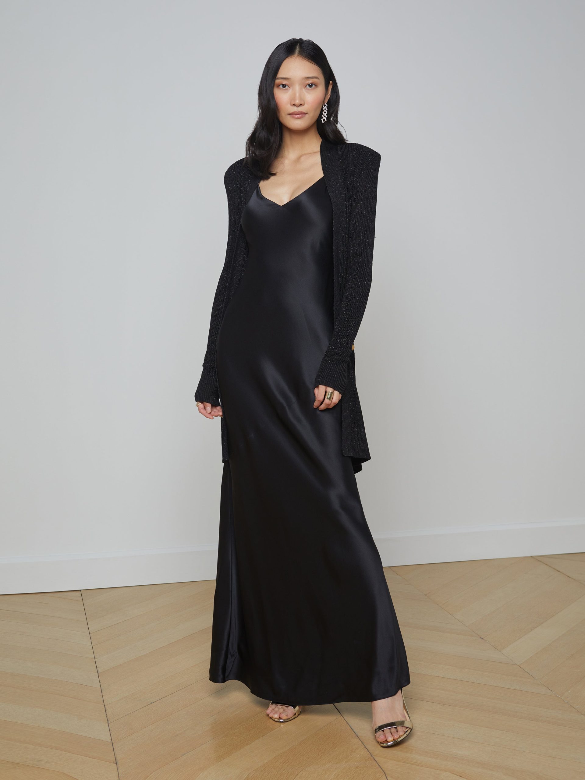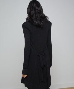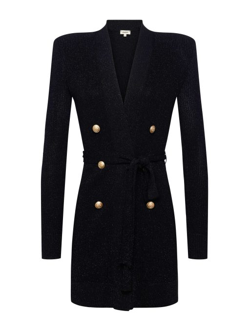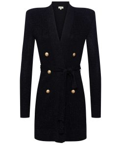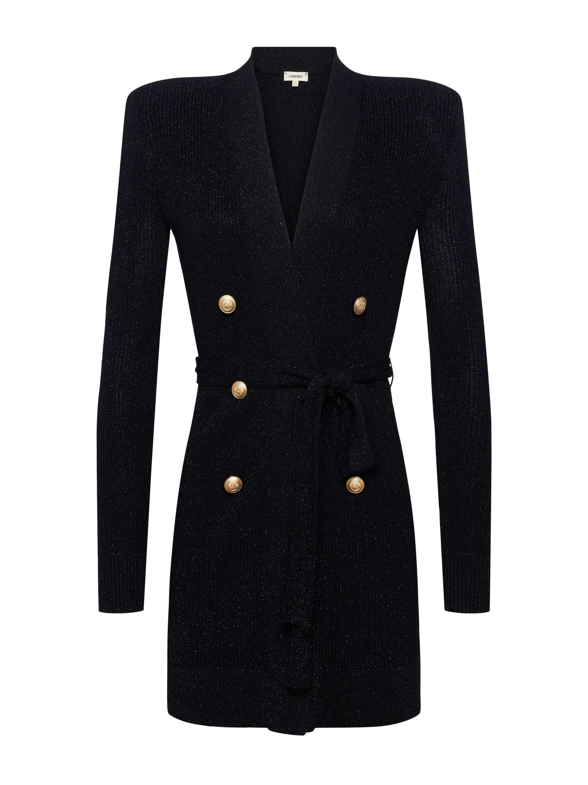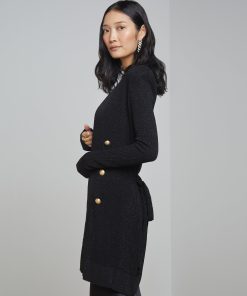 An effortlessly chic double-breasted cardigan in pure black with shimmering metallic. Slim-fit long-line design flatteringly tapers from strong shoulder to waist before falling to mid-thigh. Detailed with luxe gold embossed-dome accent buttons. Wrap-tie closure with detachable tie belt. Style No. 8578NXT2-BLAC