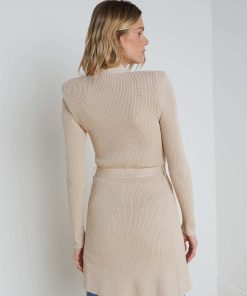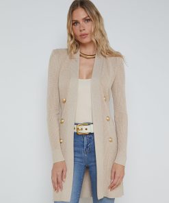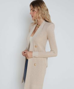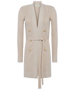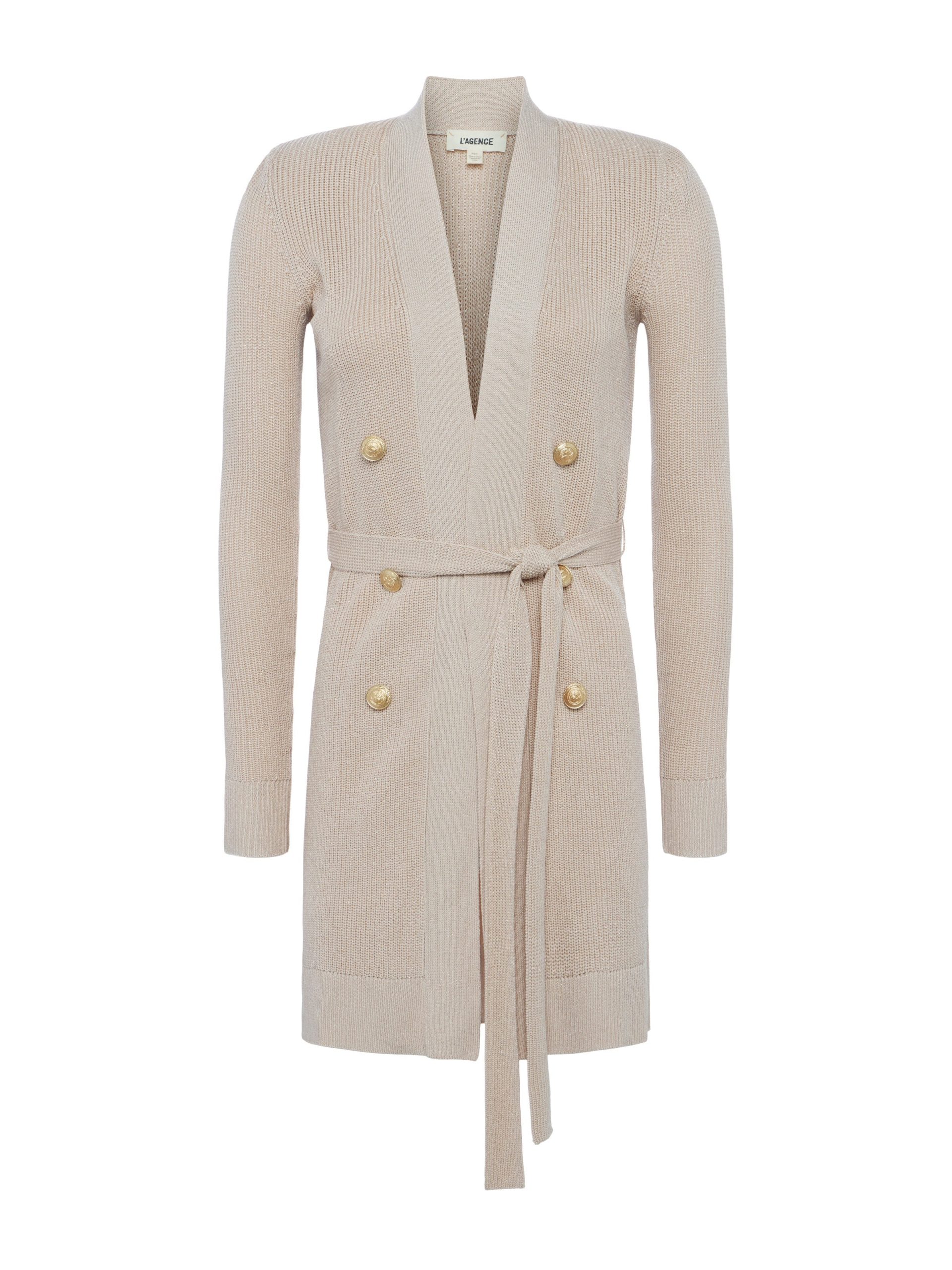 Effortlessly chic and ultra-wearable, she’s our bestselling rib-knit cardigan, and now offered in a versatile neutral with a hint of lurex. Our double-breasted Noe tapers from strong shoulder to waist before falling to mid-thigh, for a flattering, defined silhouette. Tie belt enhances hourglass definition. Finished with our signature embossed-dome accent buttons. Pair with denim for a pulled-together weekend look. Style No. 8578NXT2-PCAN