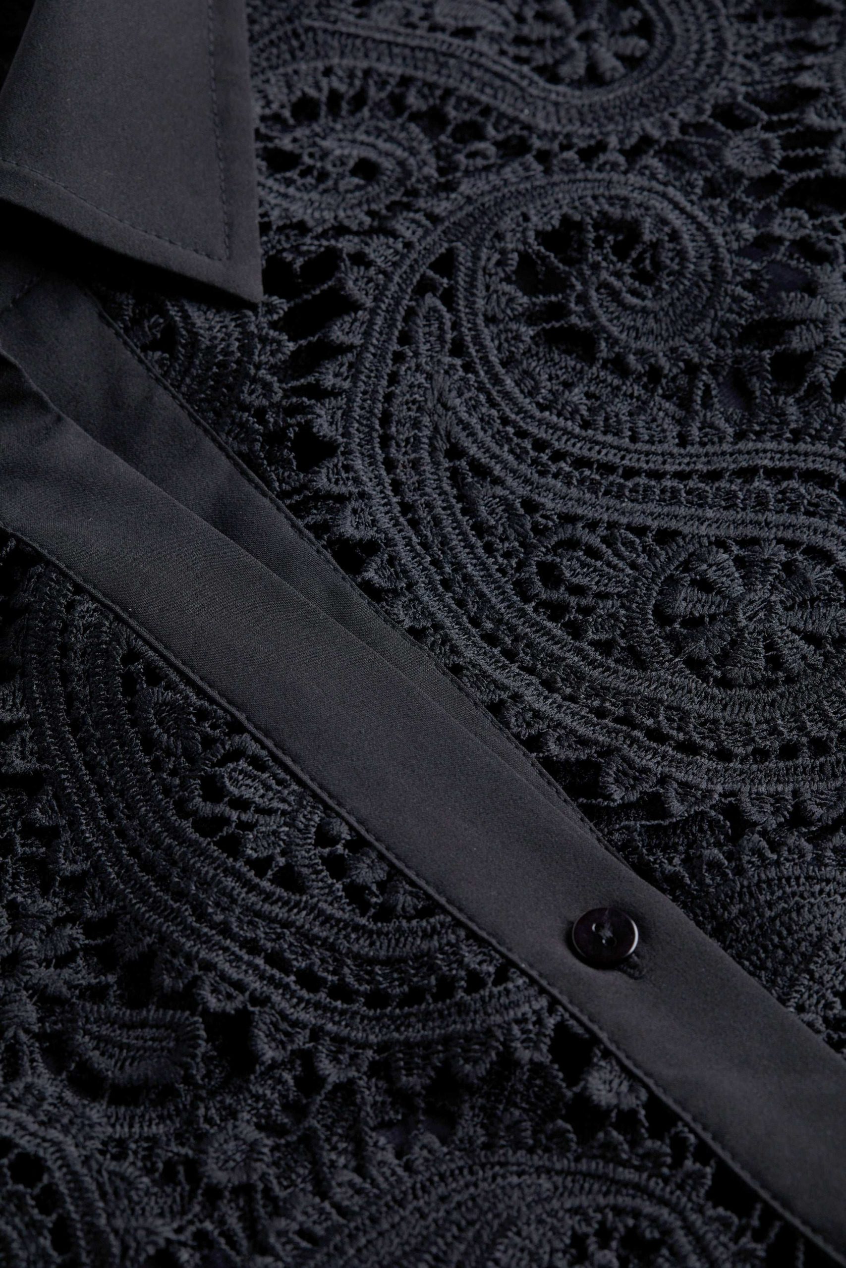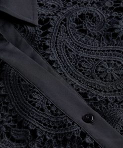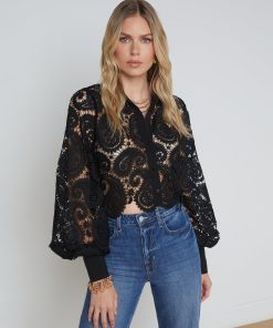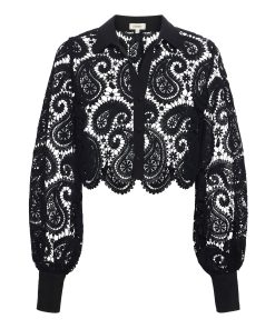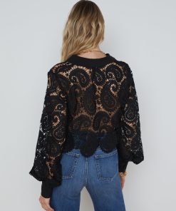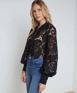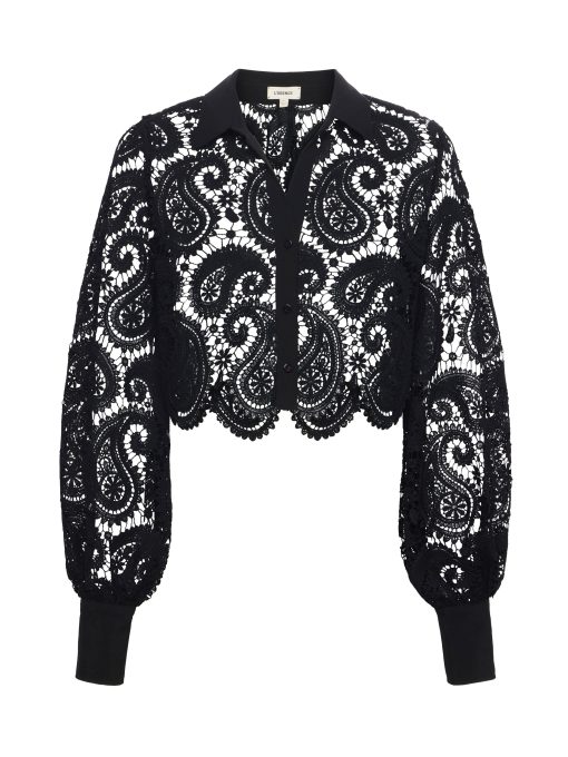 The Odelia is our modern take on the lace blouse, now in chic black. A boxy, cropped silhouette delivers a cool, effortless feel that balances the paisley lace and blouson sleeves. A sharp collar and button cuffs lend tailored crispness. Wear with black denim for a monochromatic statement. Slip on over a colorful bikini for a unique beach-ready outfit. Style No. 40624PLE-BLAC