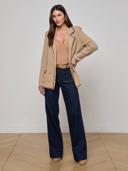 The Ranch brings laid-back elegance to the classic blazer silhouette. Crafted in structured ribbed knit, it features a double-breasted front, notched lapels, and contrast trim. Coin buttons and horse bit accents add refined distinction, making it a standout piece for desk to drinks.