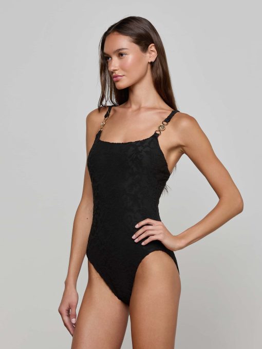 Our classic one-piece maillot swimsuit, now updated in an ornate terry design with gold coin hardware at the straps. The square neckline and high-leg cut give it a modern, sculpted edge—perfect for making a statement in and out of the water.