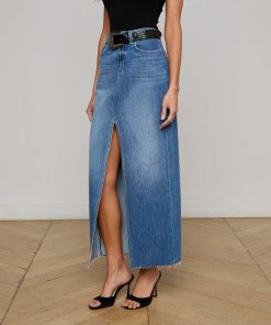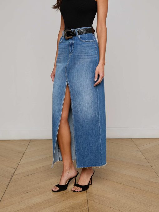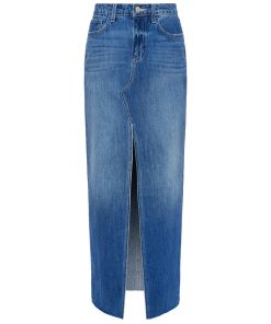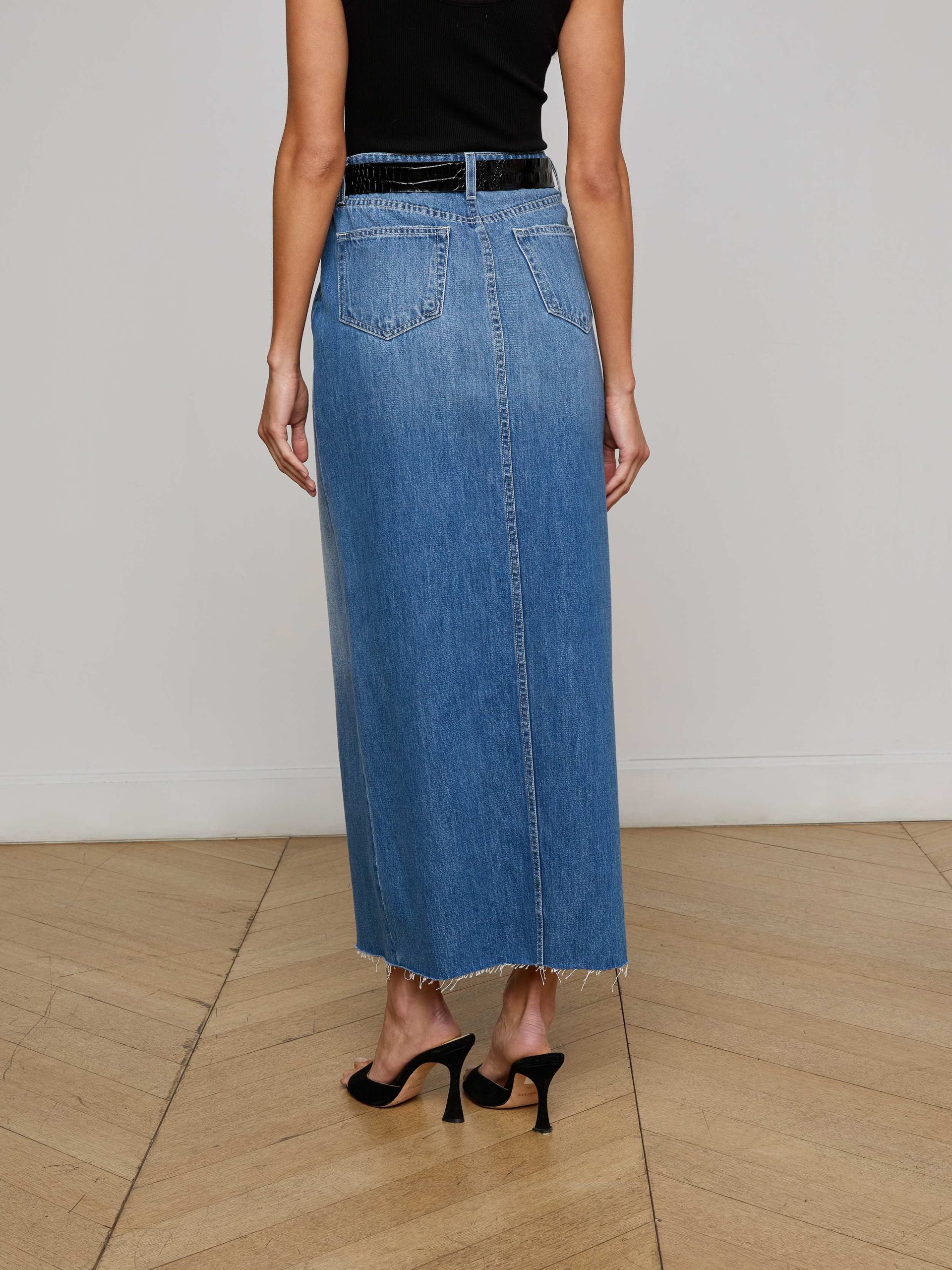 Our sultry denim maxi skirt, featuring a deep front slit for ease of movement. This timeless staple is now back in a medium wash.