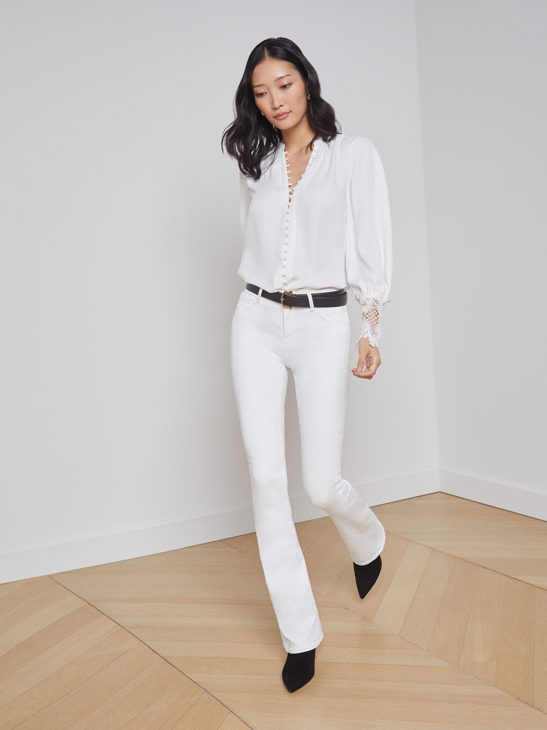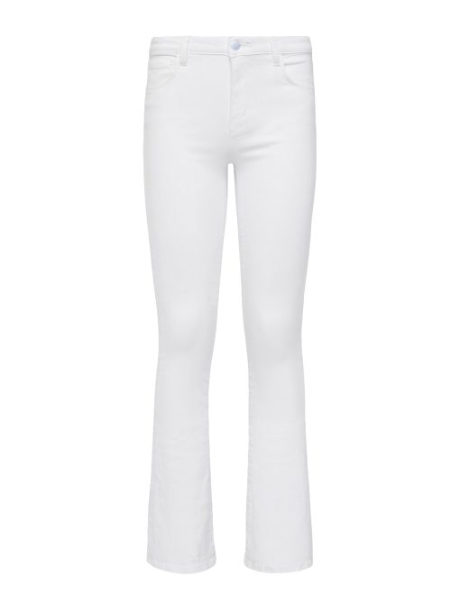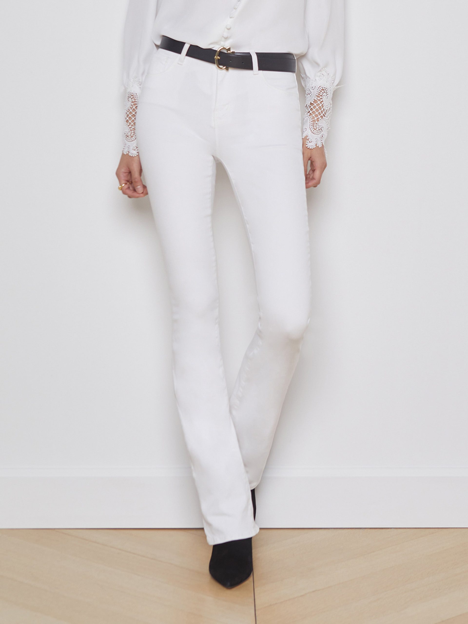 A classic high-rise jean in white premium stretch denim. Contoured waistband fits securely at the natural waist, while the design hugs from hip to knee before releasing into a slim bootcut hem. High-recovery denim holds its shape, smoothing the figure without sacrificing comfort. Classic five-pocket construction and zip fly closure. Style No. 2700PDD-BLAN