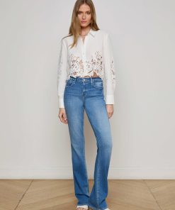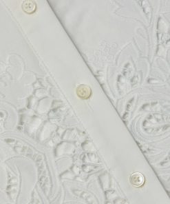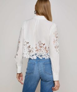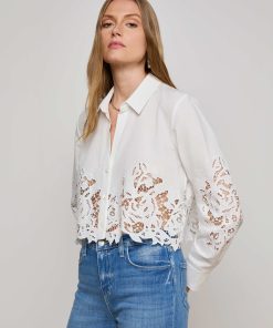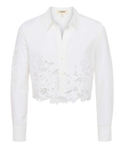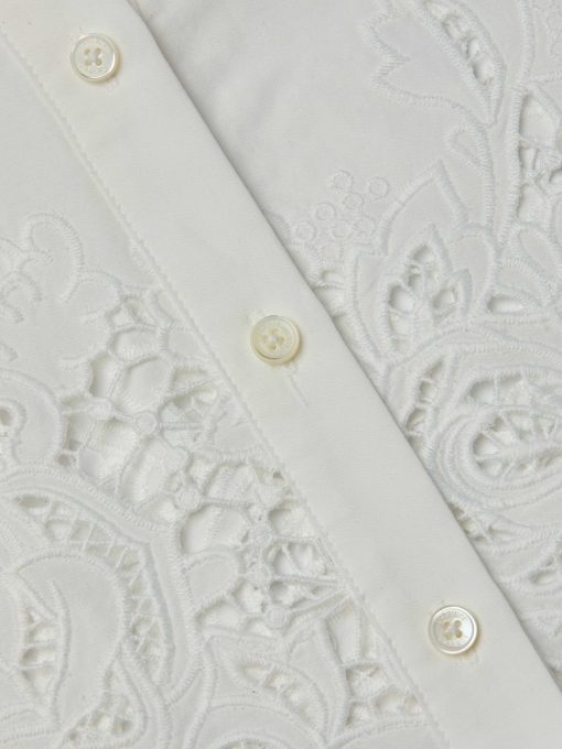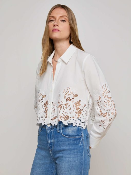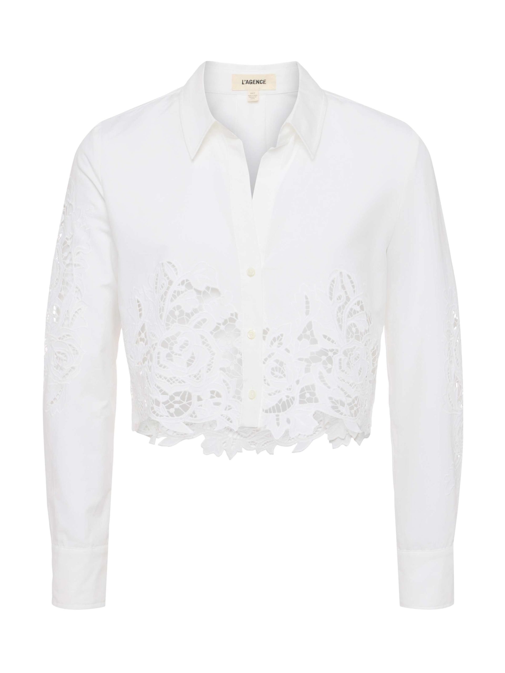 Meet the newest version of our popular Seychelle blouse, constructed with intricate floral eyelets at the sleeves and hem. This is the classic white button-down in its most feminine form.
