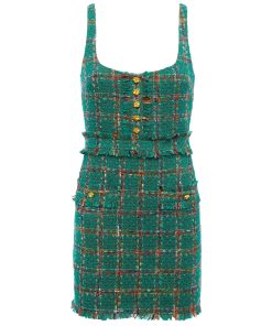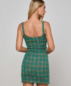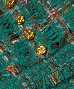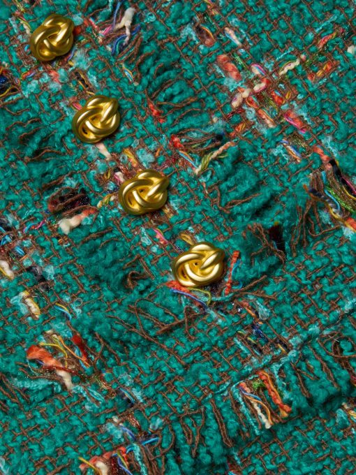 Meet the Valli, a chic tweed mini dress, featuring fringed trims and jewelry-inspired gold-tone buttons. It’s a structured, statement style with playful texture and vintage-inspired details. Now updated in green windowpane tweed, woven with vibrant threads of magenta, gold, and rust.