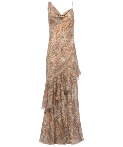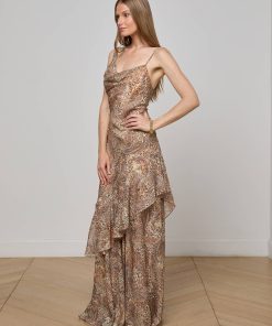The Viola gown is the perfect plus-one for weddings, galas, and every other special occasion. A cascade of gentle ruffles adds airy movement and a beautifully draped cowl neck flatters the figure. Now in a leopard-meets-paisley print.