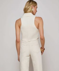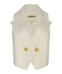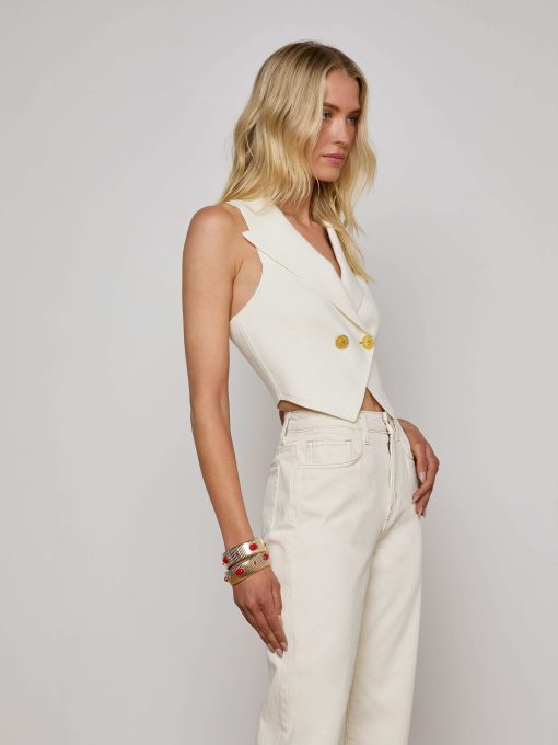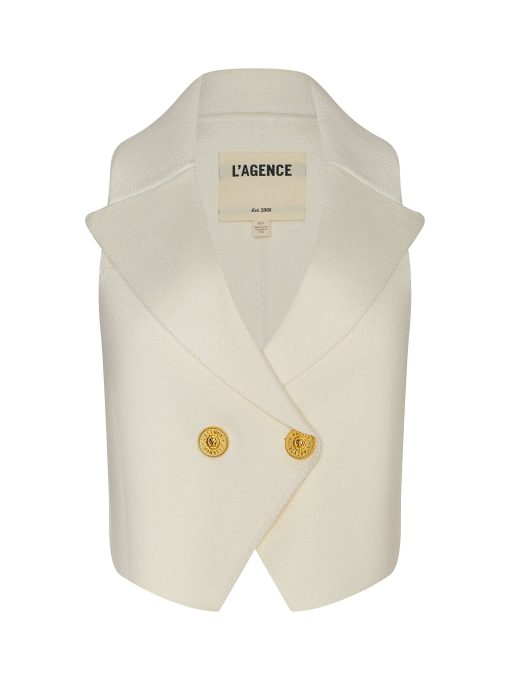 A fresh take on minimalist glamour. Lion head buttons and a wide lapel elevate this little knit vest. Wear it as a top or layer it over a button-down shirt.